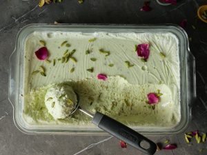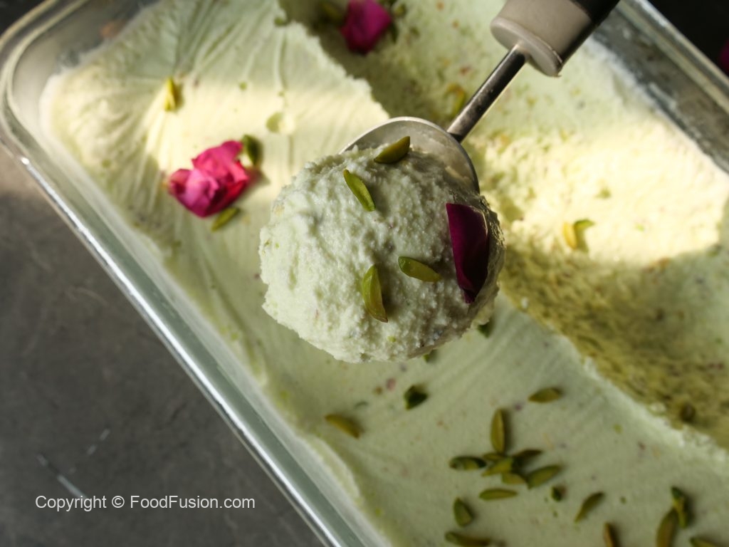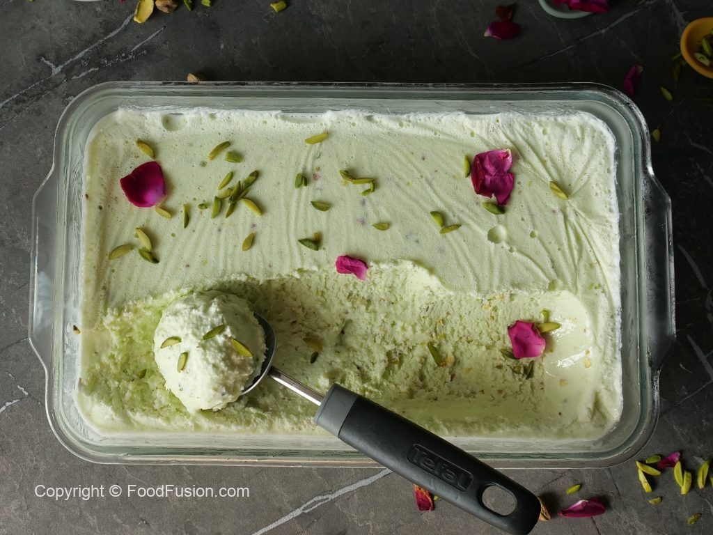 Once frozen completely,scoop out,decorate with pistachios & serve!