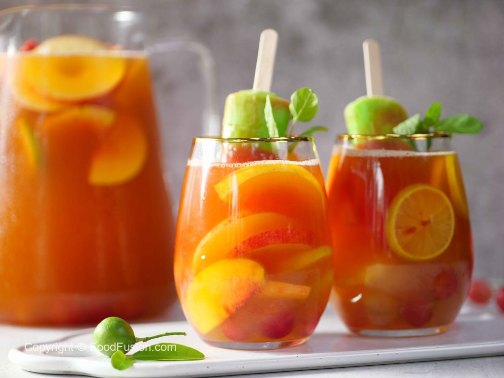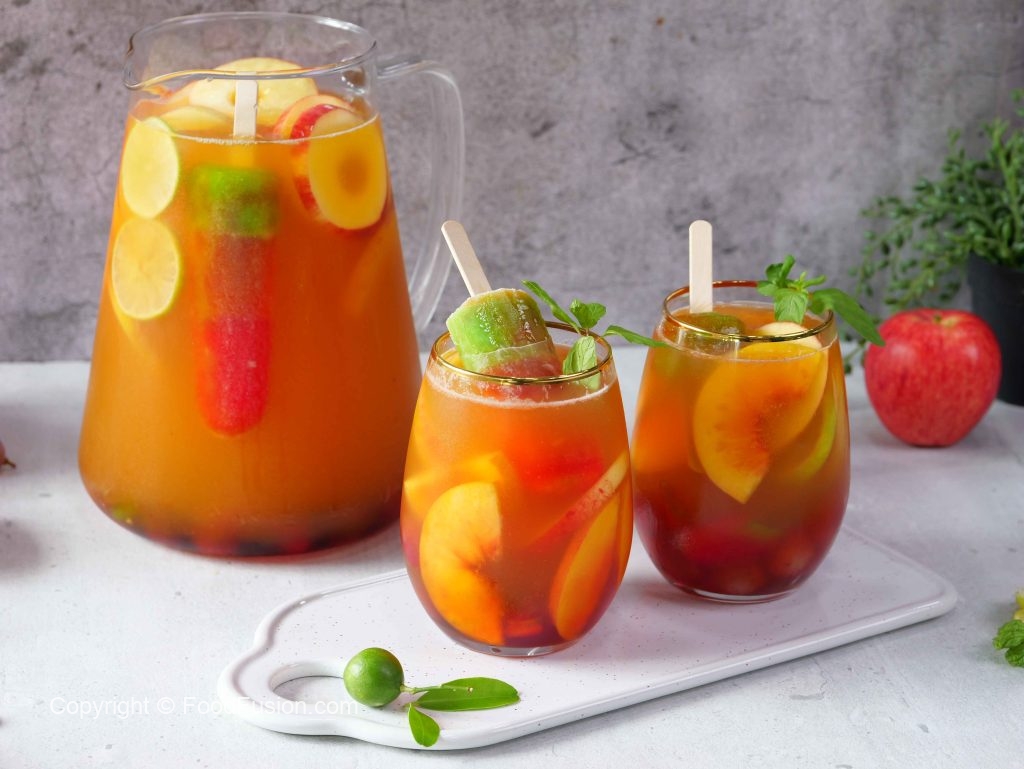 -In a jug,add ice cubes,prepared lemonade,peach,red grapes,apple,lemon,orange juice,pineapple juice, sparkling water,omore traffic light & mix well.