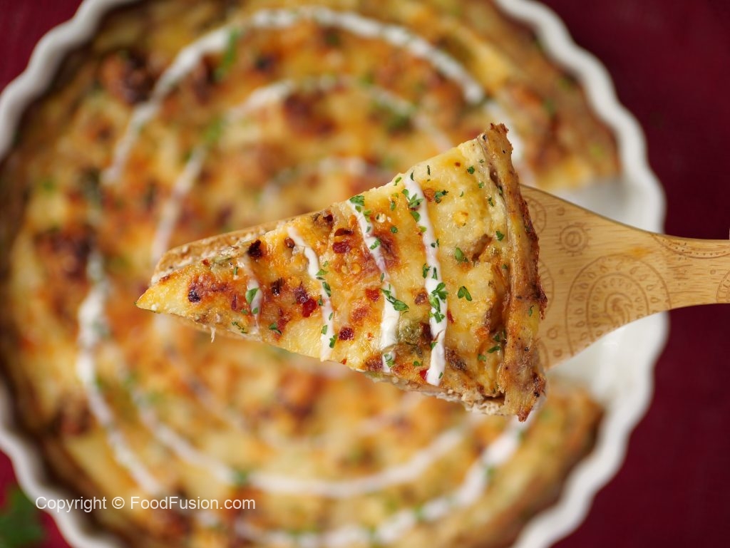 -In a greased pan (9-inches),add potato mixture,spread evenly & grease with cooking oil & prick with fork.