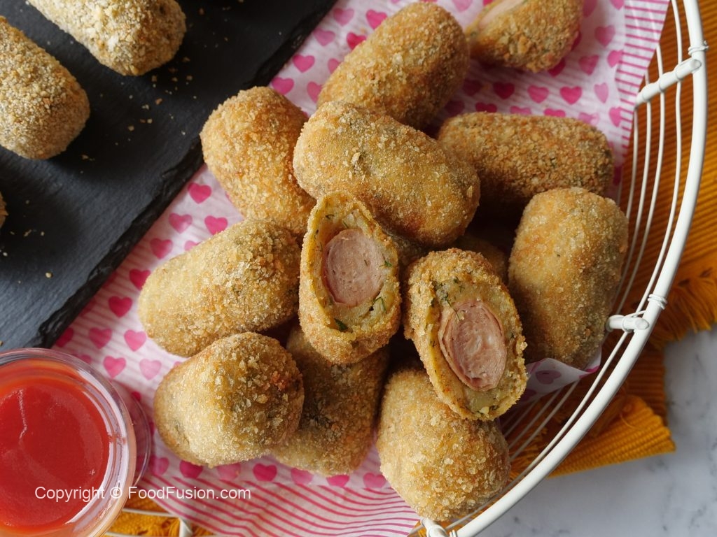 -Ab fried sausage rakh dein aur aloo mixture sa cover ker lein & ek jaisay sizes ka croquettes tayyar ker lein.