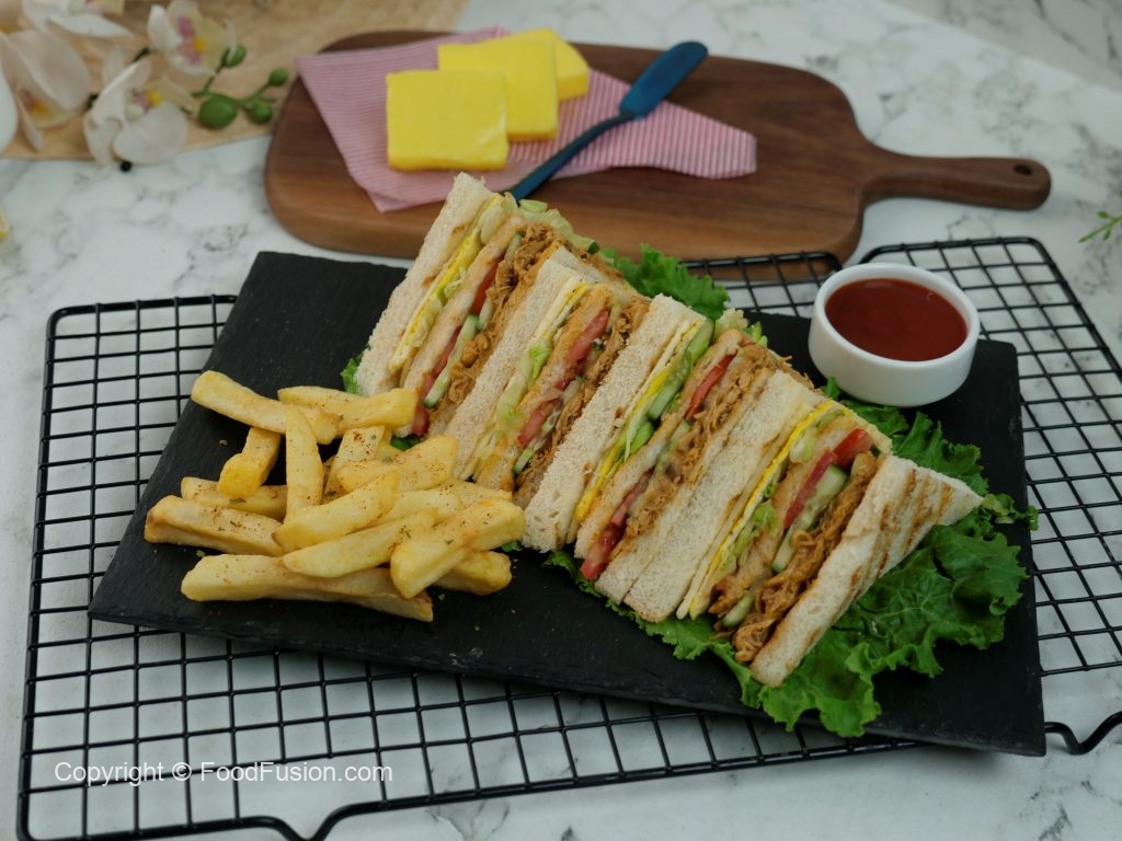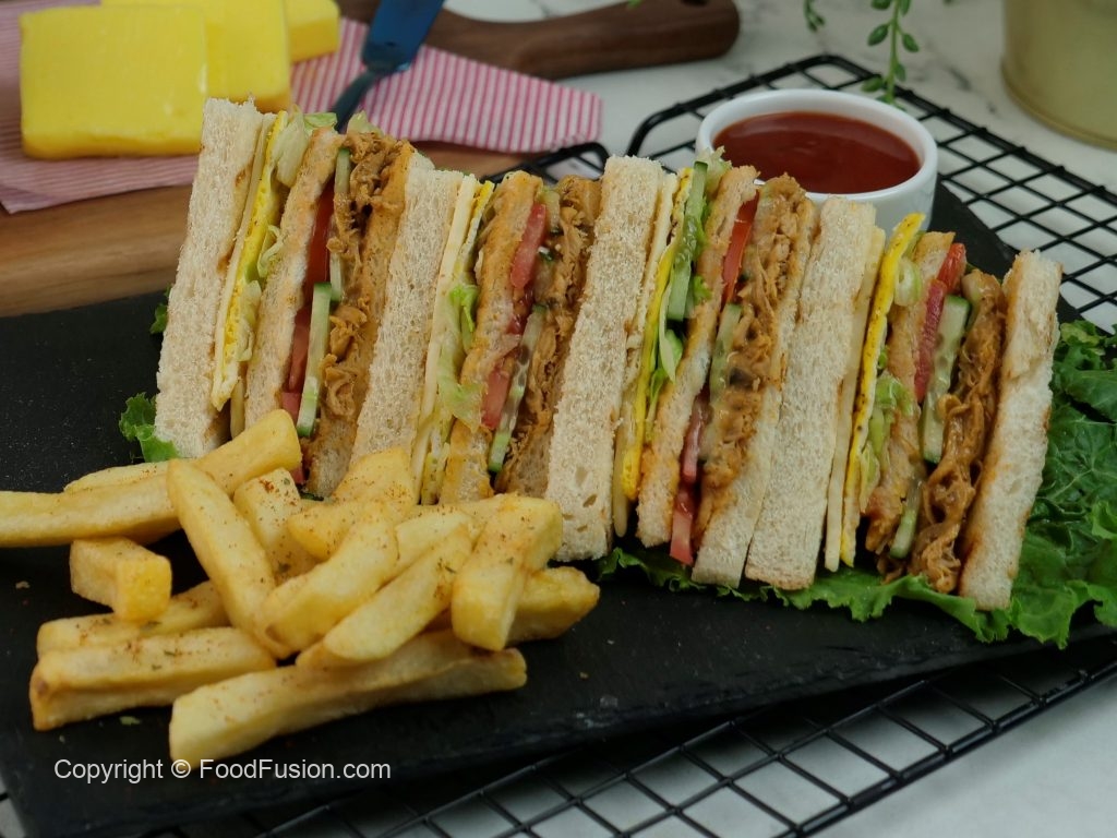 Bread slice mein pulled chicken dal ker pheela lein,kheera slices aur tamatar slices dal dein, another toasted bread slice rakh dein,tomato ketchup,ice berg,tayyar anda aur chedder cheese slice rakh ker upper sa toasted bread slice rakh dein (makes 4-5 sandwiches).