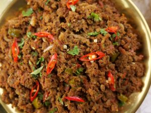 -In a wok,add beef mince,onion,tomatoes,ginger garlic paste,green chilli paste,yogurt,turmeric powder,salt,kashmiri red chilli powder,red chilli powder,garam masala powder,mix well & marinate for 15 minutes.