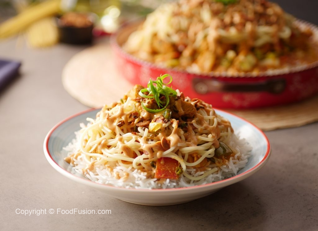 In a serving dish, add boiled rice & drizzle prepared sauce over it. Add prepared chicken with vegetables, boiled spaghettis, fried garlic & green chillies, prepared sauce, garnish with spring onion green & serve!