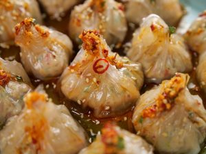 -Drizzle dipping sauce,garlic chilli oil,sesame seeds & serve!