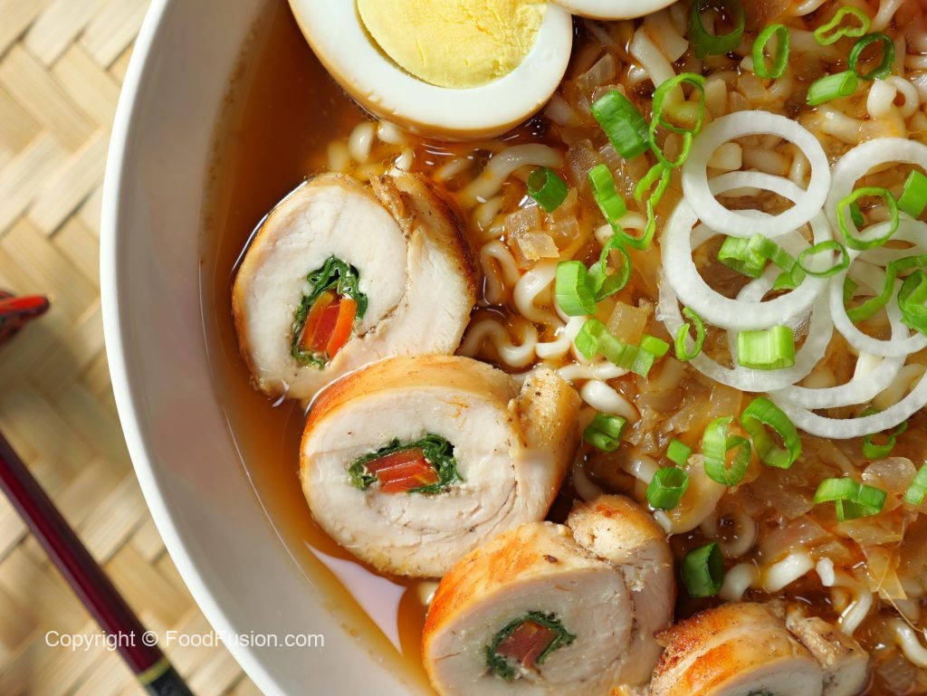 -Serving bowl mein ramen noodles, carrot, chicken slices, soy sauce eggs, reserved chicken broth, spring onion aur spring onion leaves dal kar serve karein!