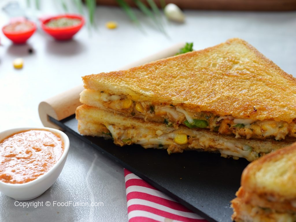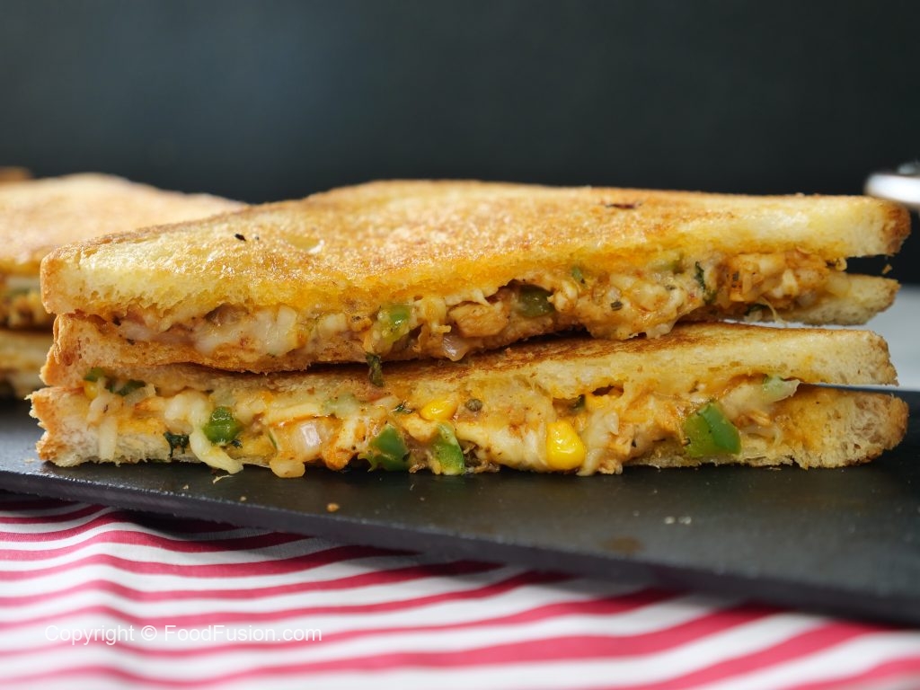 -On two large bread slices,apply butter,add & spread prepared filling on one bread slice & flip the other bread slice & apply butter.