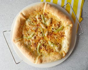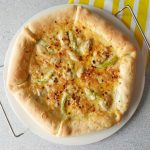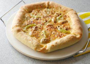 Mozzarella cheese,cooked chicken,mushrooms,pyaz,lal mirch crushed,cheddar cheese,shimla mirch aur mozzarella cheese dal ker lal mirch crushed sprinkle ker lein (makes 2 large pizza).