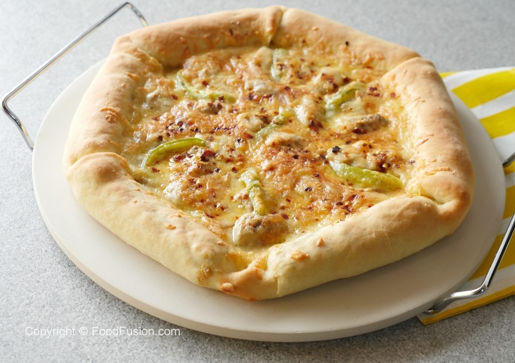 Add mozzarella cheese,cooked chicken,mushrooms,onion,red chili crushed,cheddar cheese,capsicum, mozzarella cheese and sprinkle red chili crushed (makes 2 large pizza).