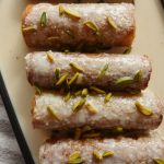 Serving dish mein bread rolls ups rakh dein aur neem garam doodh dal dein.