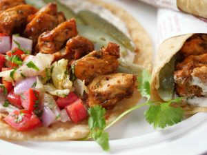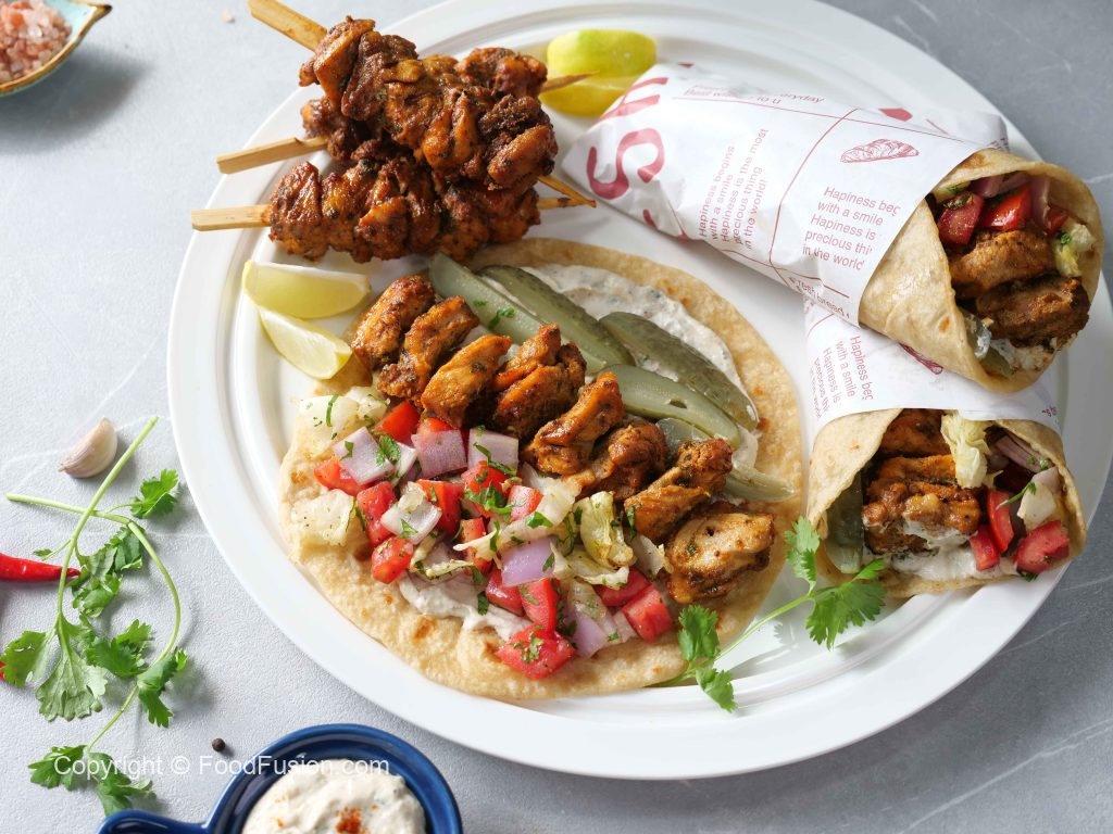 -On tortilla,add& spread prepared tahini sauce,paprika powder,prepared chicken,prepared salad, pickled cucumber,fold & wrap in butter paper & serve!
