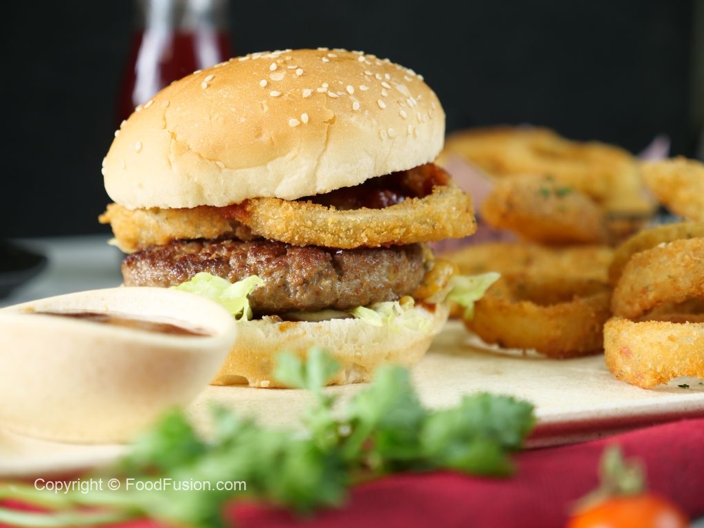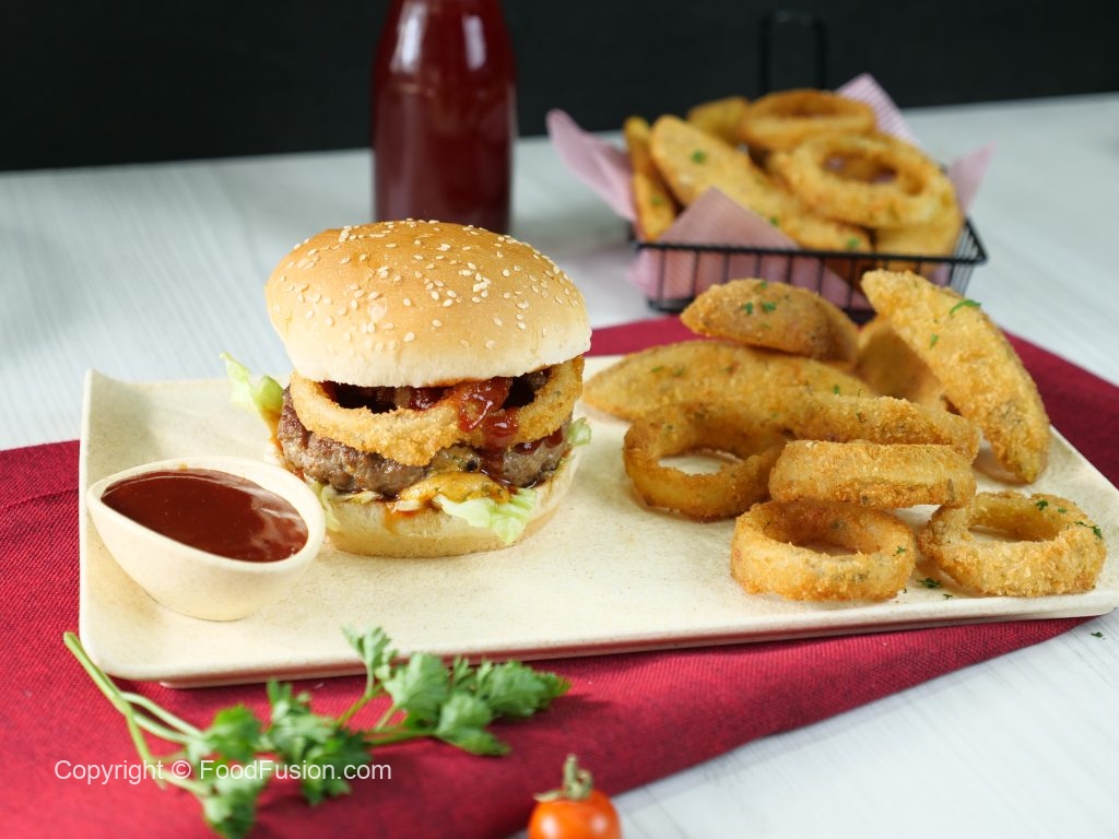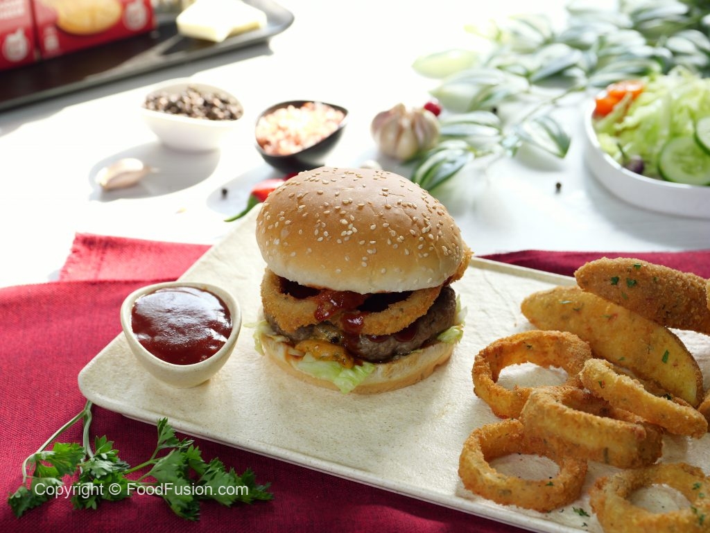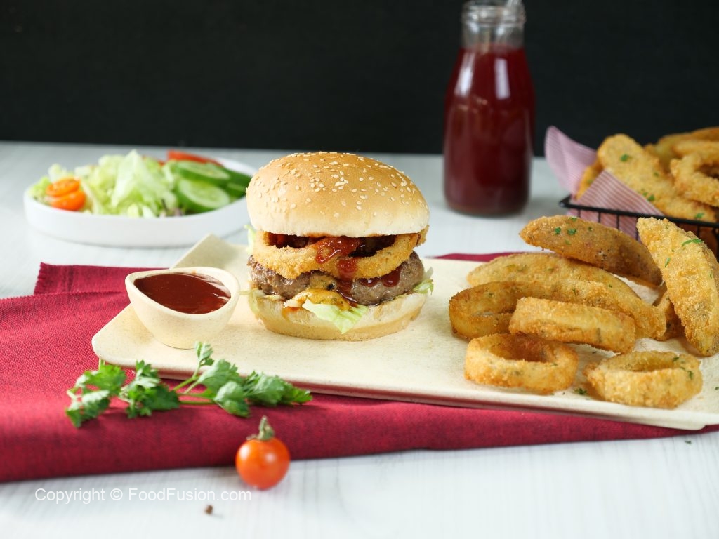 -On a burger bun,add & spread tomato ketchup,add iceberg leaves,beef patty,crispy onion rings,tomato ketchup & cover with top burger bun & serve with prepared crispy onion rings & potato wedges (makes 4).