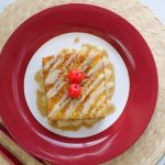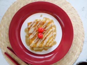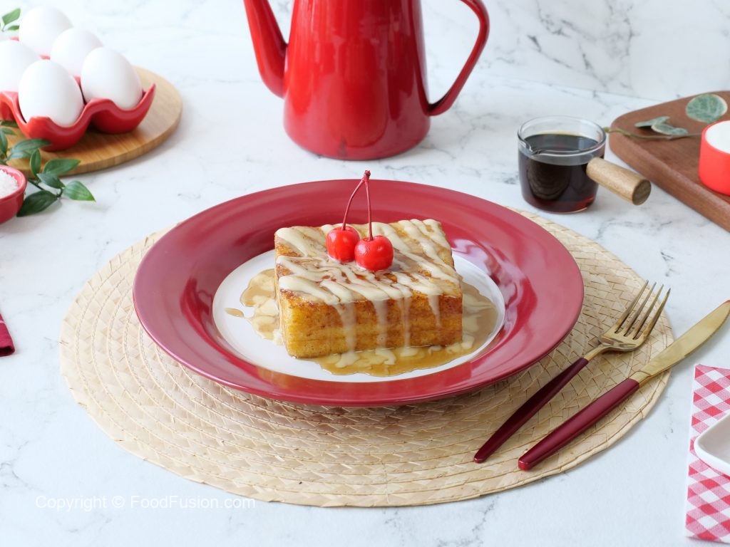 -On french toast,drizzle vanilla cream sauce,pancake syrup,garnish with cherries & serve!