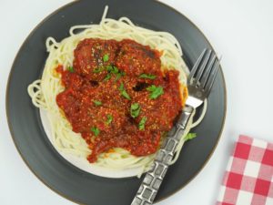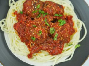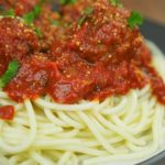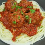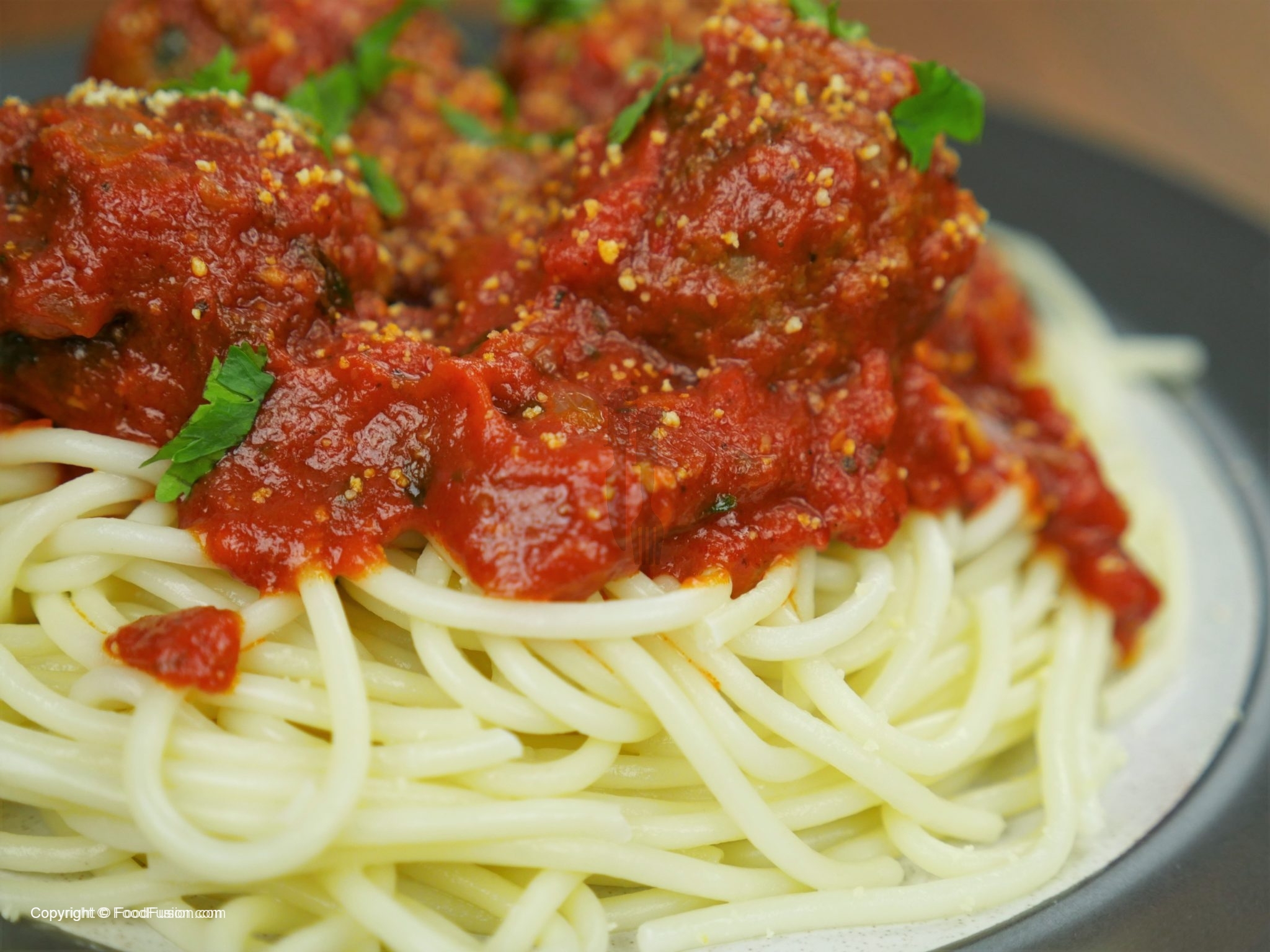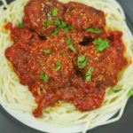 Add spaghetti in a platter, pouring sauce and meatballs and finally sprinkling cheese of your choice and coriander.