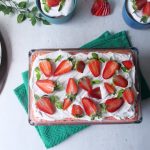 Slowly pour prepared tres leches milk over the hot cake filling holes & let it seep in then refrigerate for 4 hours or until chilled.