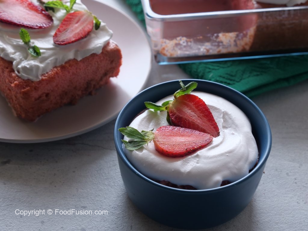 Just like you get at bakeries Strawberry Tres Leches Cake. Now make it at home and enjoy your day. #HappyWomensDay #WomensDaySpecial #FoodFusion #HappyCookingToYou #PakolaMilk