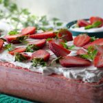 Add prepared frosting over the cake & spread with spatula. Decorate the cake with strawberries then cut & serve!