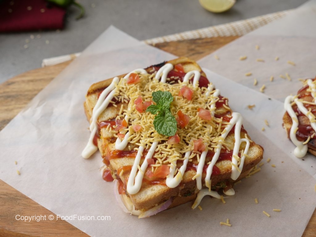 Cut sandwich into four pieces,drizzle tomato ketchup,mayonnaise,sev nimco,tomato & serve!