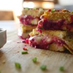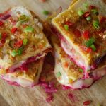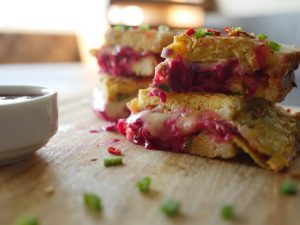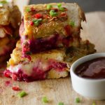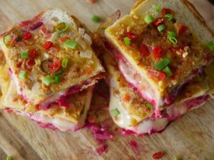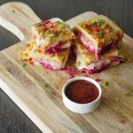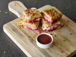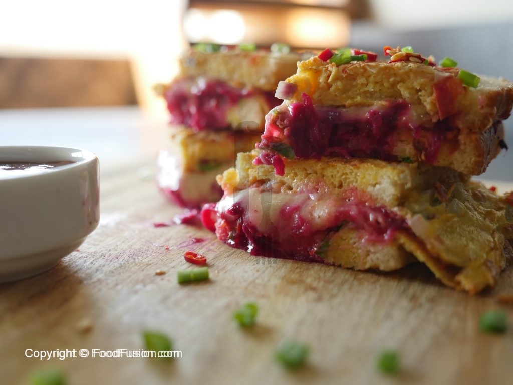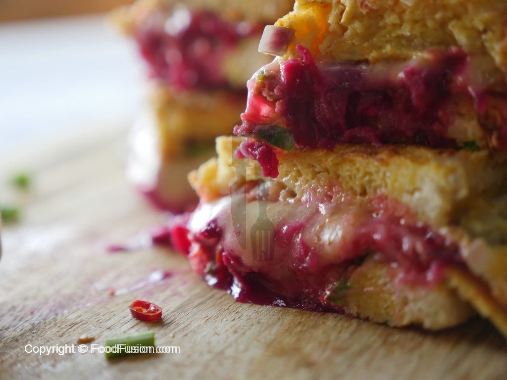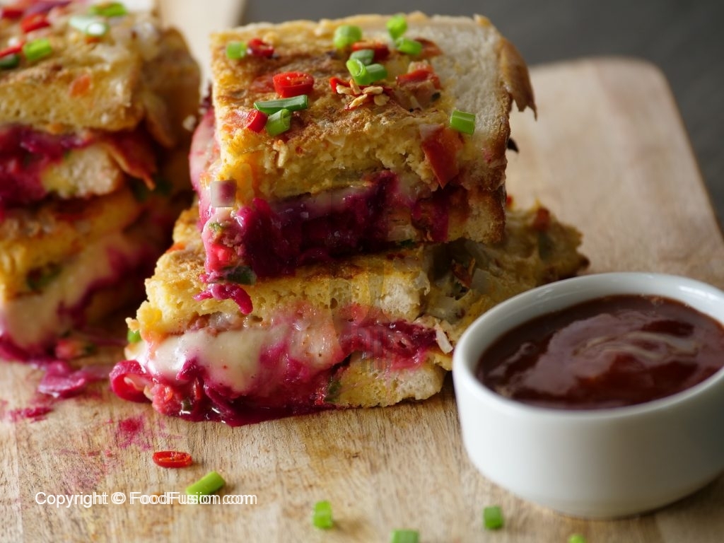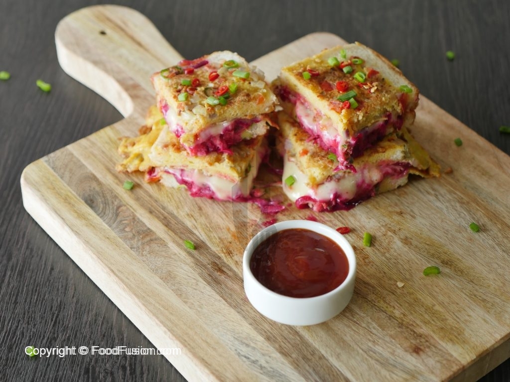 Add cheddar cheese,mozzarella cheese,beet root,chaat masala,tomato ketchup then cover with top slice.