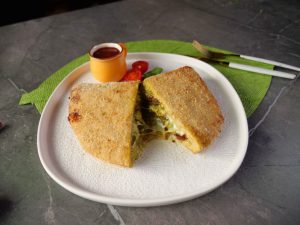 -Add prepared pesto & spread on half side,add mozzarella cheese,baby spinach,sun-dried tomatoes, fold,seal properly & coat with breadcrumbs.