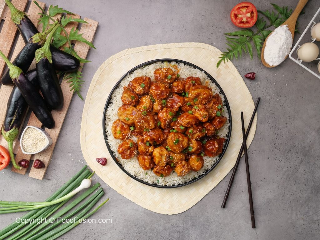 -In a wok,heat cooking oil,dip eggplant slices in prepared batter & fry on medium flame until golden & set aside.