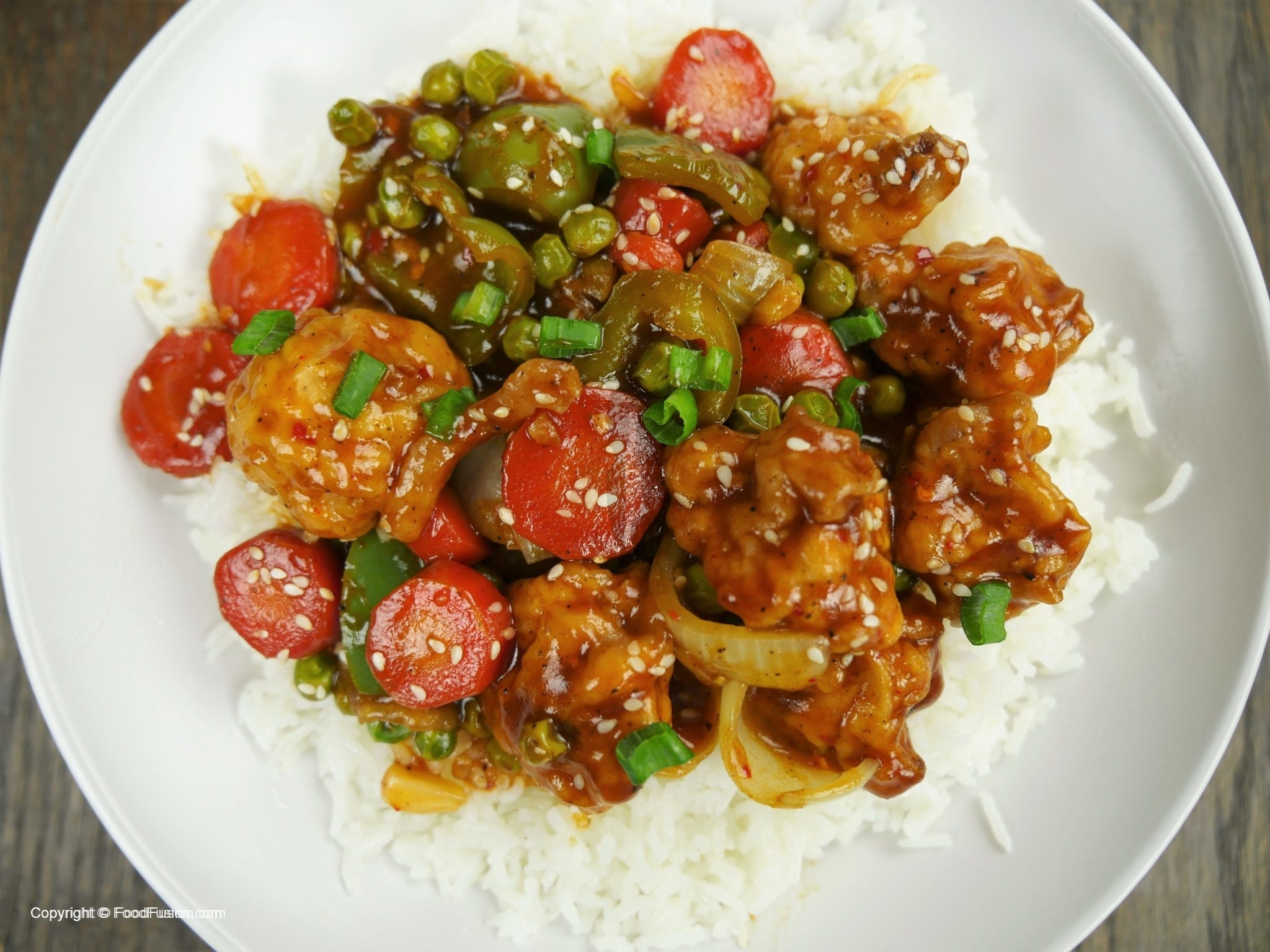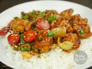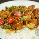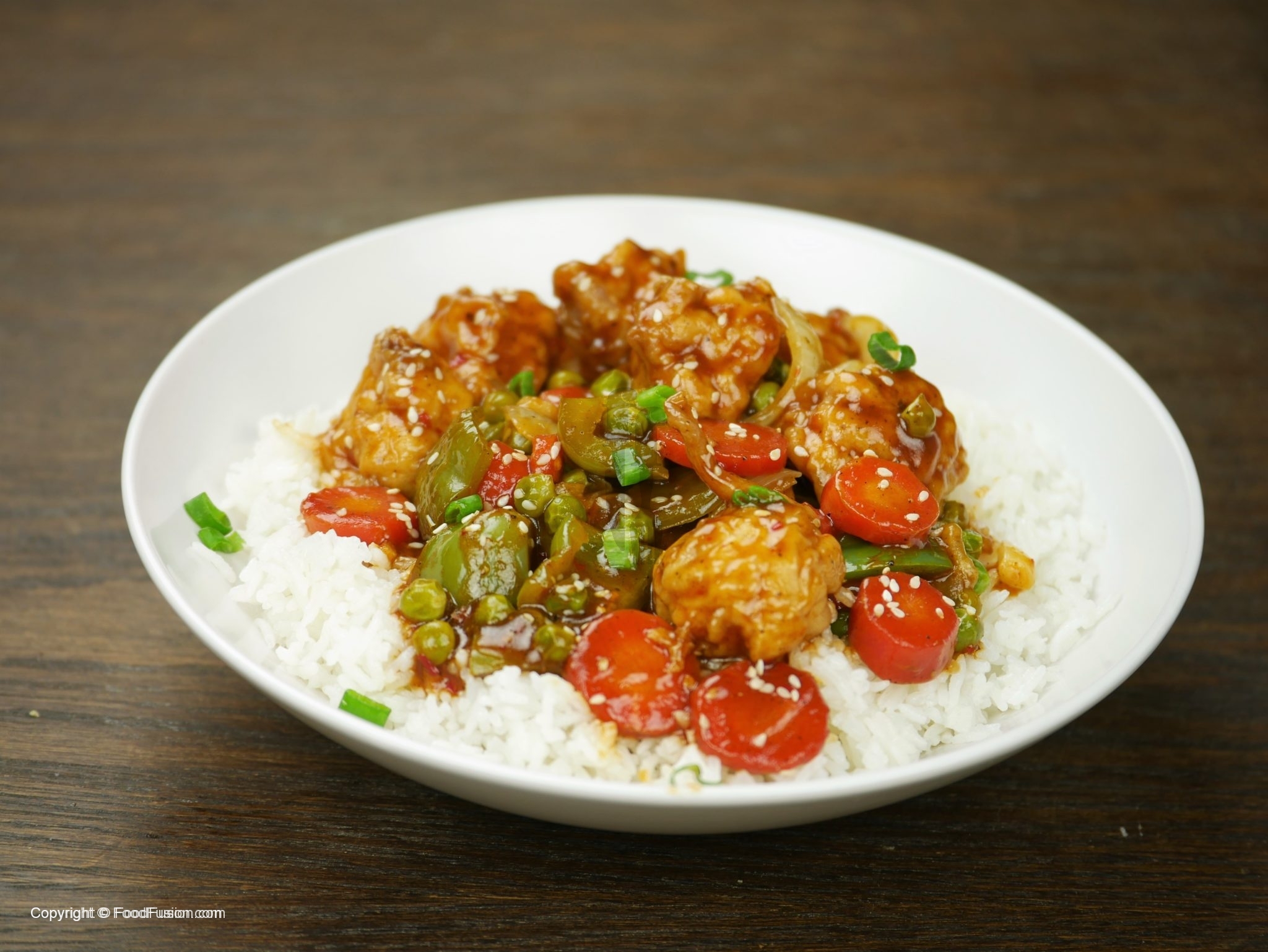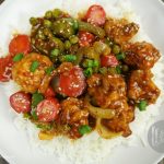 In wok,add oil and garlic (chopped) and sauté little. -Add tomato ketchup,soya sauce,worcestershire sauce,vinegar,brown sugar,red chili crushed,white pepper powder,black pepper crushed,salt and mix well. -Add chicken stock, mix it and bring it to boil. -Dissolve corn flour in water and mix well. -Add corn flour paste in gravy and give it a good mix. -Now add fried vegetables and cauliflower, mix it. -Add sesame oil and mix well. -Garnish with sesame seeds and green onion.