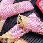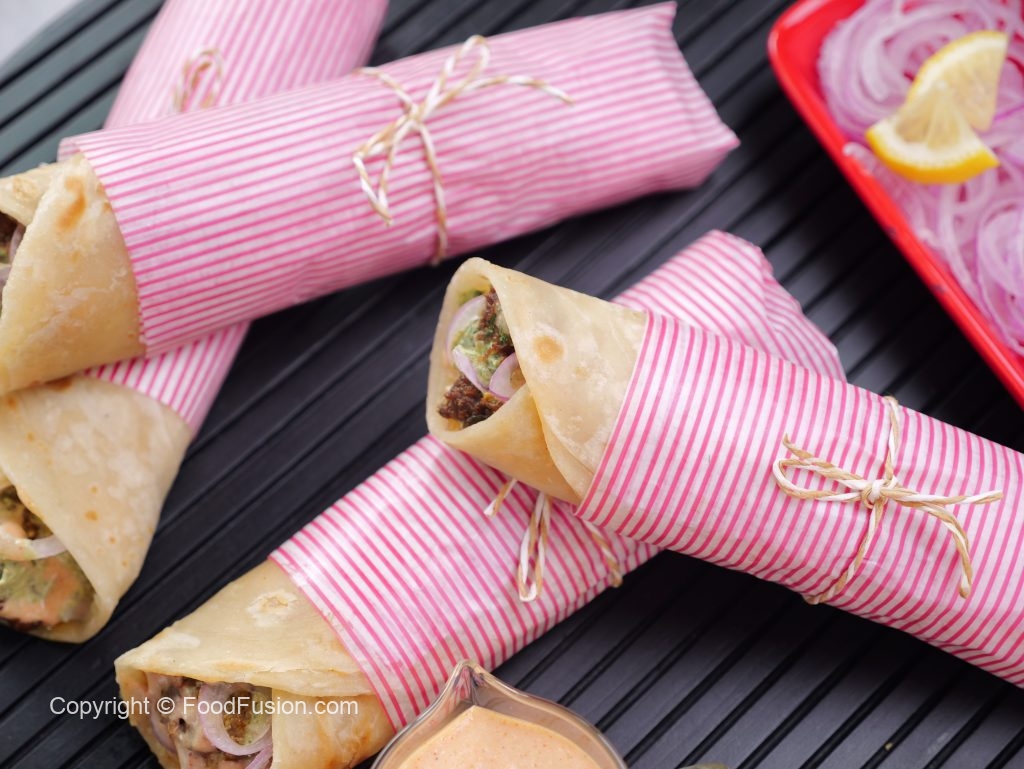 -Paratha per mayo sauce,cooked beef cubes,pyaz rings,hari chutney aur mayo sauce dal ker butter paper mein warp ker ka serve karein (makes 4-5).