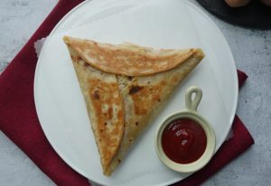 Add cheddar cheese and potato & chicken filling,fold & seal tortillas/roti to make a triangle (makes 6).