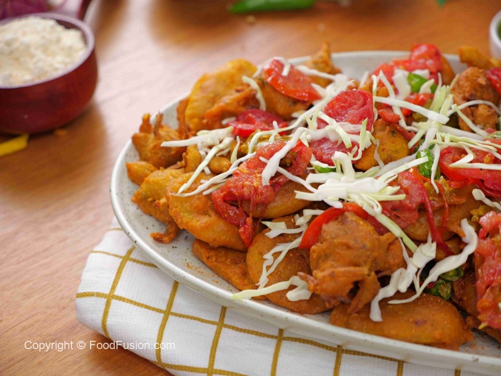 -Serving platter mein fried pakoray, fried tamatar aur hari mirch ke slices, achar dalein, band gobhi se garnish karen aur serve karen!