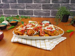 -In the same cooking oil (180 C), add tomato slices & green chilli slices, fry on high flame for 1 minute.