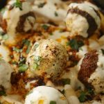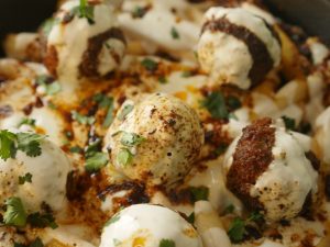 On serving dish,add potato fries,cooked meat balls,garlic yogurt,pour heated meatballs oil,fresh coriander & serve!
