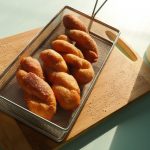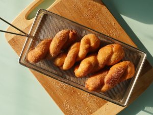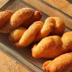 Take a piece of dough and roll it out on your working place so it forms a rope 8 inches long and ½ inch in diameter.If it’s sticky,sprinkle some flour on the area you’re working in.When you roll out the dough, move one hand upward and the other downward so that the rope is twisted in between your hands as you roll it (makes 15-16).