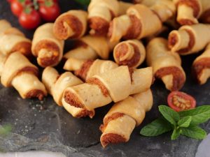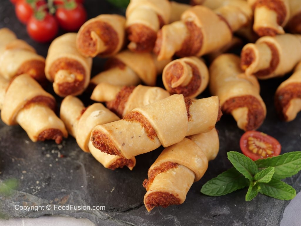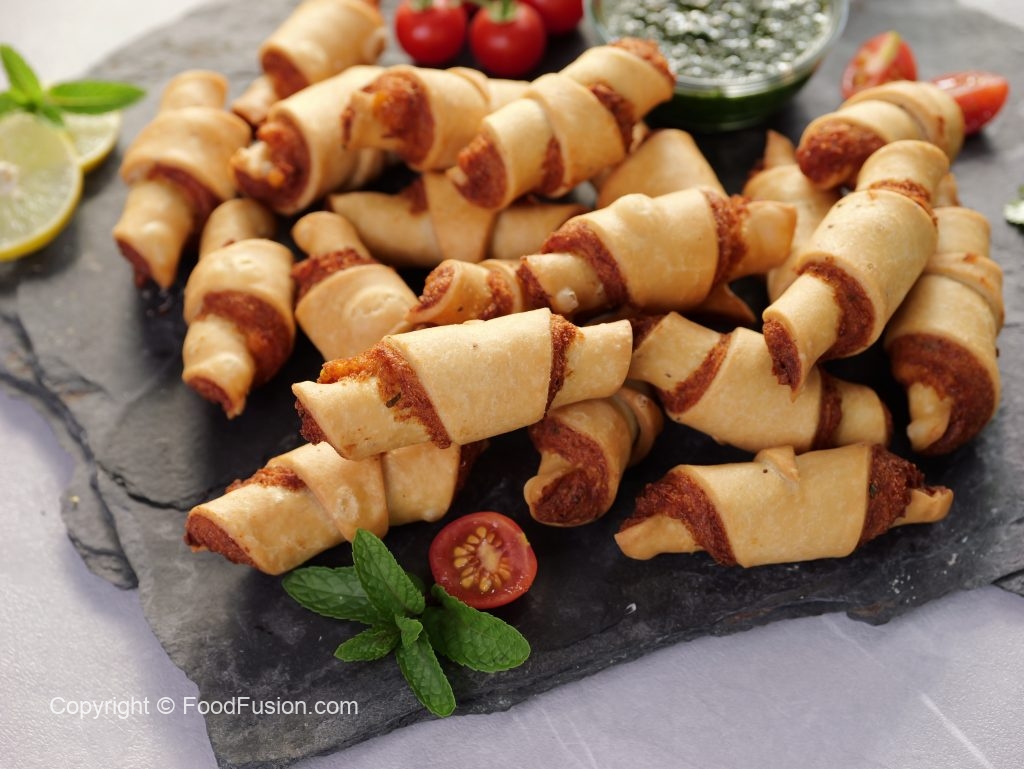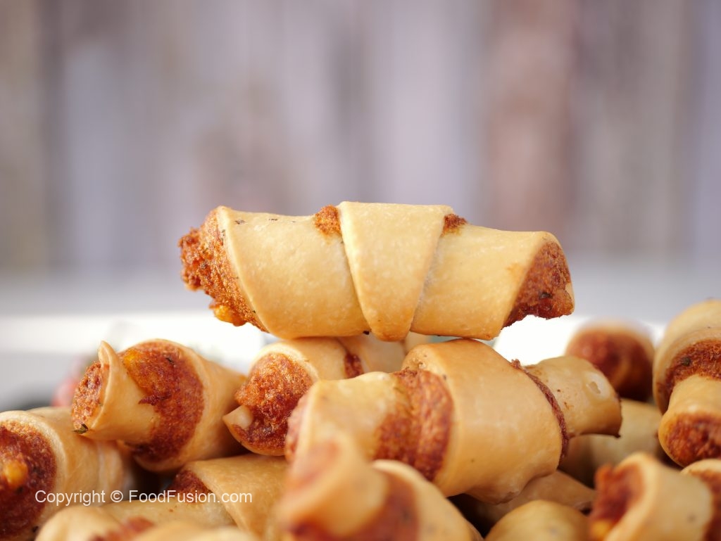 -Roll out each triangle i-e from outer side towards inner side like a croissant shape & seal the end properly (makes 36).