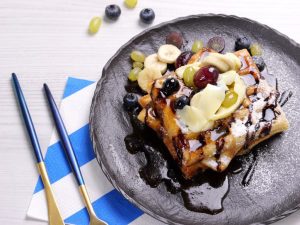 -Waffles per cheeni aur chocolate syrup dal dein.