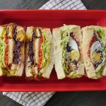 On cling film,place bread slices,spread cream cheese,ice berg,tomato slices,cucumber,egg & chicken mixture,purple cabbage mixture,boiled egg,carrot mixture and top with another slice,wrap in cling film then cut into two pieces & serve!