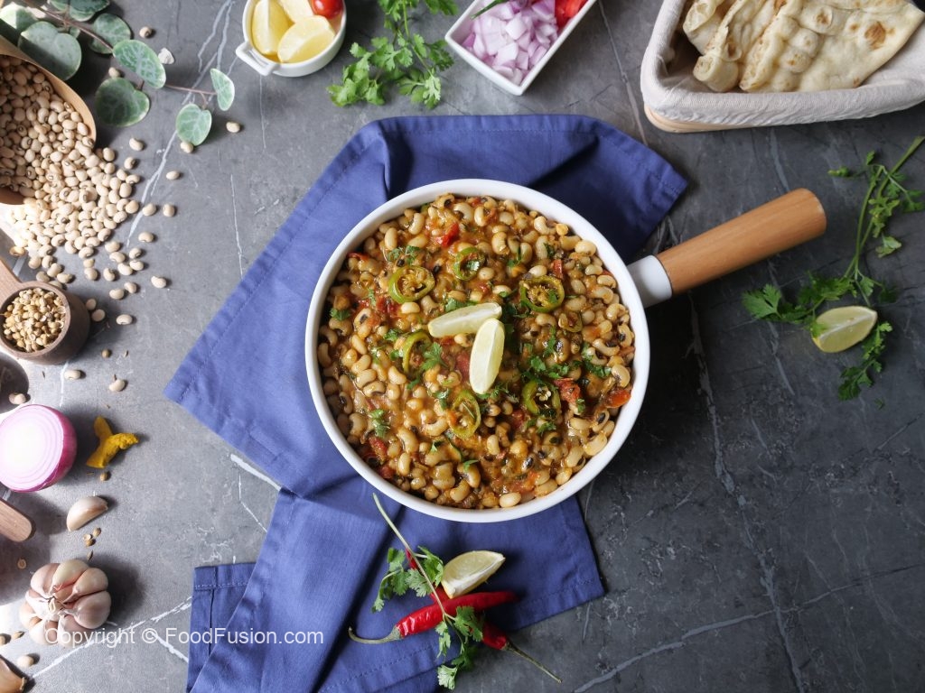 -In a pressure cooker,add black eyed beans,salt,water & mix well,cover & pressure cook for 12-15 minutes then strain & set aside.