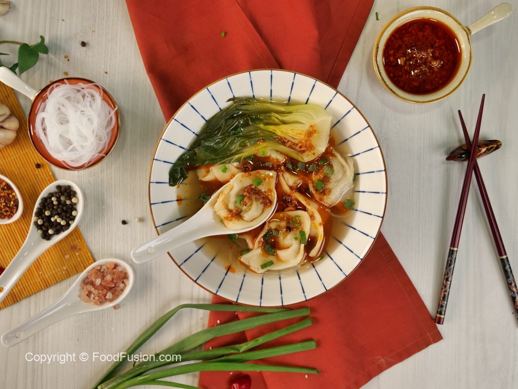 -In a bowl,add glass noodles,prepared wonton soup,bok choy,chilli oil,spring onion leaves & serve!